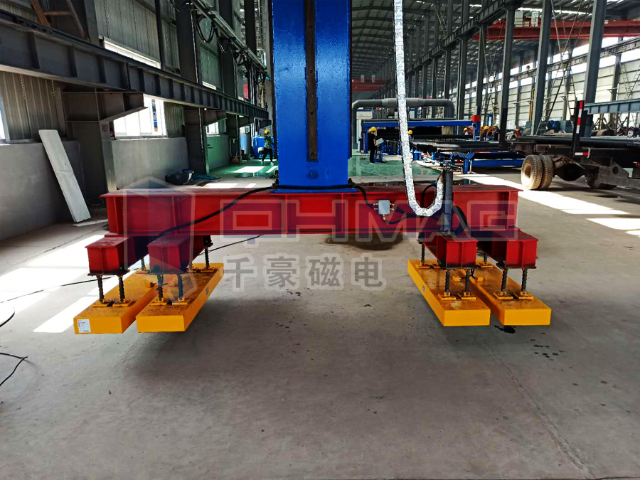 4臺并排鋼管電永磁起重吊具通過橫梁串聯(lián)起來,輕輕松松起吊4根長鑄管,與傳統(tǒng)機械吊具相比,鋼管電永磁起重吊具有更高的安全保障,采用PLC智能控制器進行操作,簡單易上手,效率高,而且能更大程度的保證操作的安全。鋼管電永磁起重吊具最大的特點是起吊過程中,只在吸起和放下的瞬間才用電,其他起升搬運過程由磁力吊具內(nèi)部的高性能永磁體提供強磁吸力,所以在突然斷電的情況下,千豪鋼管電永磁起重吊具依然具有不變的吸力,保證鑄管不掉下來。